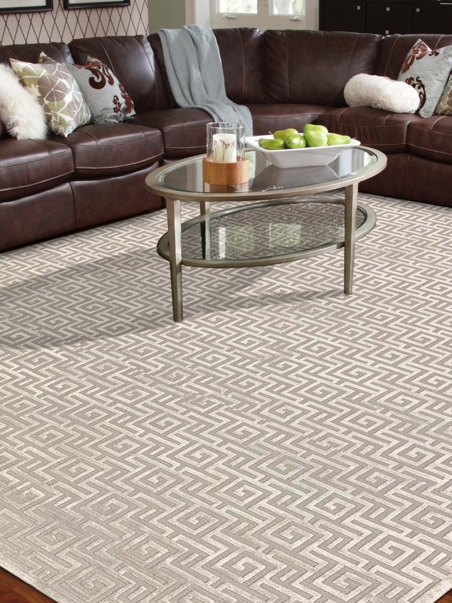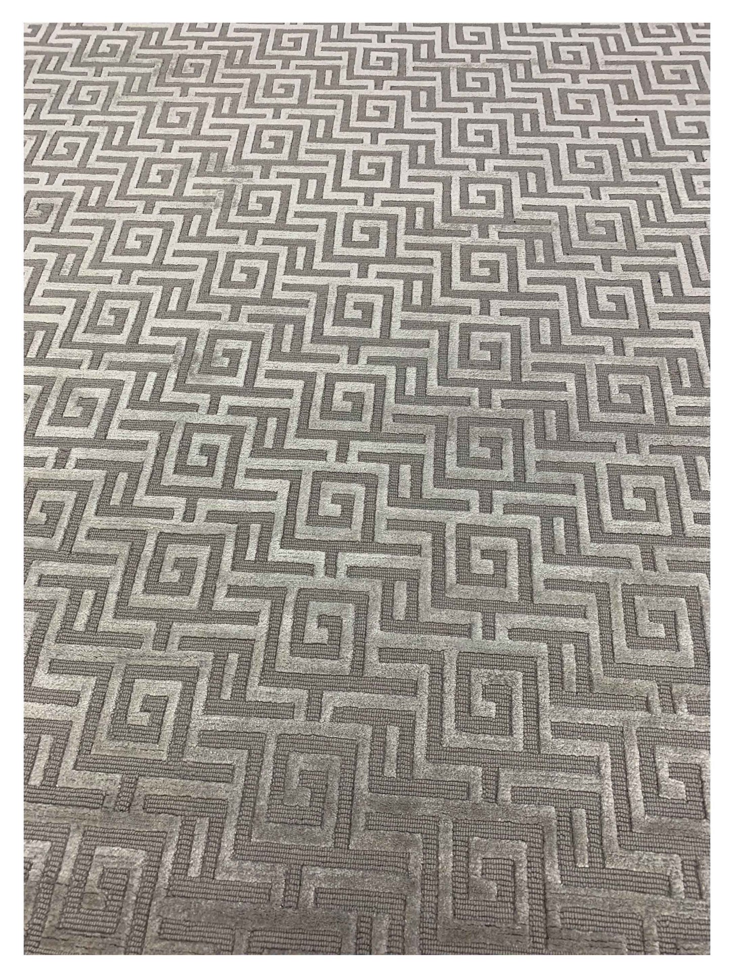 New Zealand yarn loops create a stylish, soft, and smooth finish, while the cut pile of Viscose is intricately hand trimmed to various heights, offering a stunning three-dimensional quality to the design.