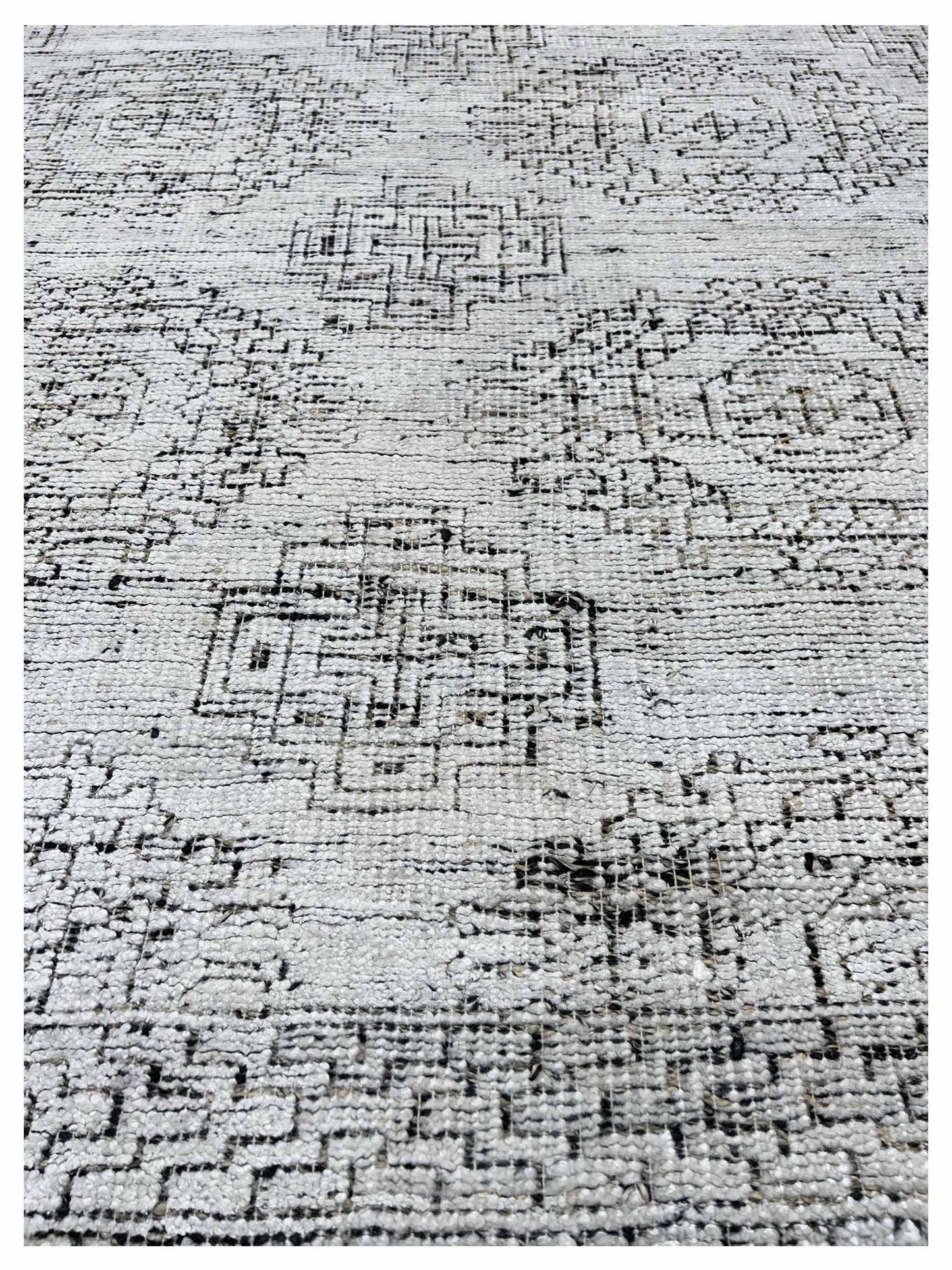 Introducing an exquisite addition to your home decor that seamlessly blends modern and vintage aesthetics. This knotted rug showcases small medallions in a beautifully distressed design, offering a timeless appeal. Available in both black and white, this piece is crafted to suit a variety of interior styles.