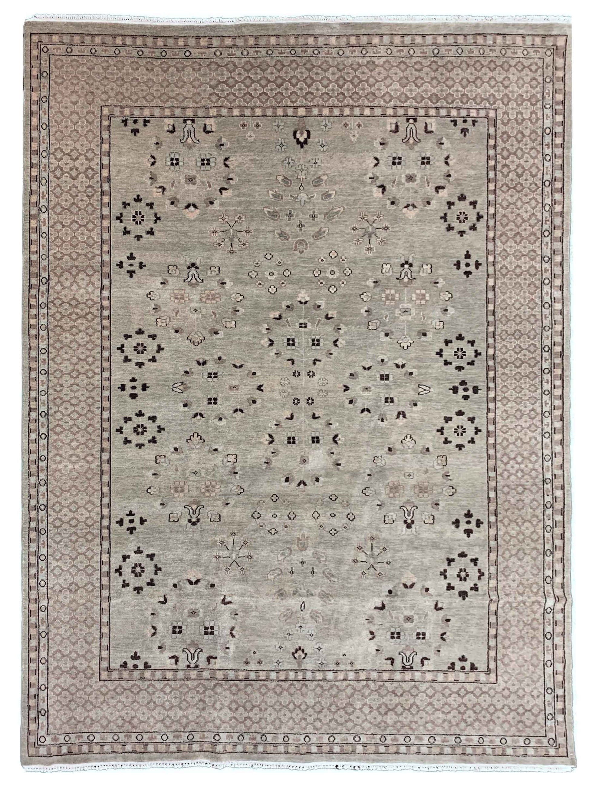 Oushak is undeniably the most famous rug style in the United States. The best-selling rugs in the world come from Anatolian region of Turkey. Champagne can only come from the region of Champagne, France. Just the same, a true original oushak will only come from Turkey. While we can never match a true Oushak rug for its style and technique, we have developed the experience to make a rug that matches its beauty. We use the best available long fiber New Zealand wool and expose it to a family recipe of dyeing to arrive at the perfect combination of hues and shades of colors. Master weavers carefully weave knots into designs. Next, we wash the rug as closely as was done in Turkey. Although we have not created a masterpiece, the result is as close as it can be. This rug will last for generations, and it will be a conversation piece for years to come.